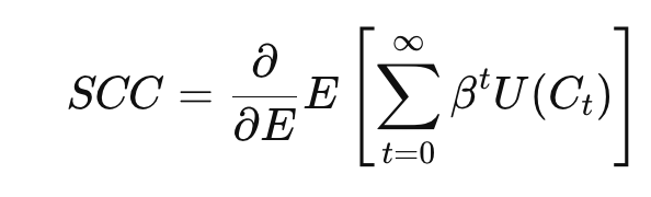 où Ct est la consommation globale à l’année t, β le facteur d’actualisation, et U la fonction d’utilité. et E l’espérance mathématique, étant entendu qu’il s’agit d’un calcul statistique. Le CSC correspond alors à la dérivée marginale de cette utilité par rapport aux émissions : de combien la consommation future sera affectée demain quand on évite une tonne de CO₂ aujourd’hui.